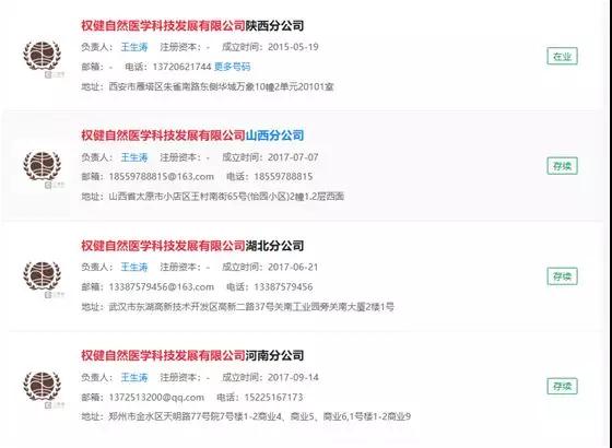 权健公司于2013年才获得商务部颁发的直销牌照,被批准允许的直销地区包括有天津、四川、浙江、湖南、辽宁、山东、江苏、广东、河北、北京是个地区,在工商信息调查中发现,权健自然医学科技发展有限公司在陕西、山西、湖北、河南、安徽、黑龙江等地区都成立分公司,企业法人都是王生涛。《直销管理条例》对跨地区经营有明确规定,在非直销地区不能进行直销,若是在非直销地区开展直销活动,是属于违规经营。