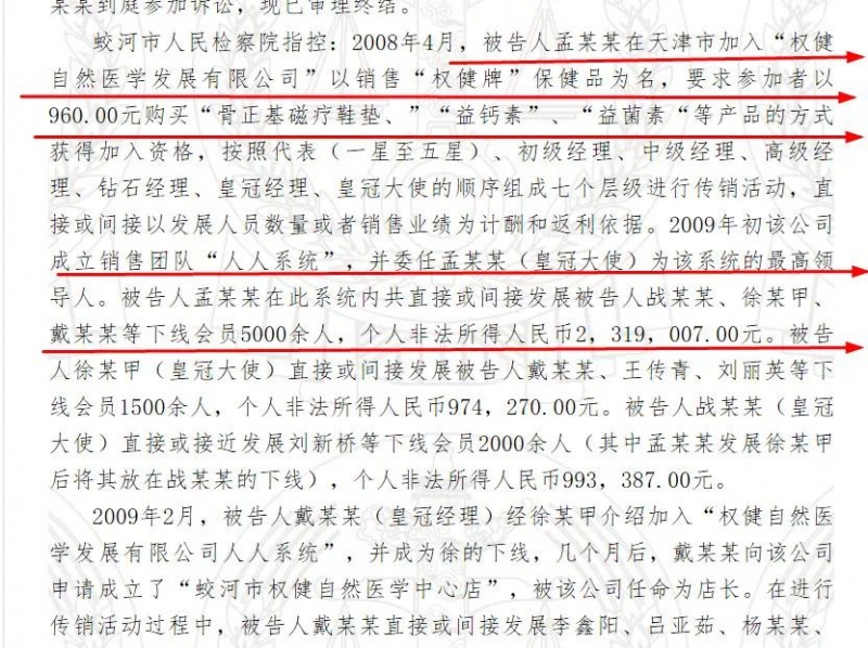 ①2012年,吉林省蛟河市人民检察院就曾指控孟某等4名被告,在天津加入权健自然医学发展有限公司后,以销售权健牌保健品为名,进行传销活动,直接并间接发展了下线会员超过5000人,个人非法所得人民币231.9万元,被判处组织、领导传销活动罪,处以5年以下的有期徒刑。