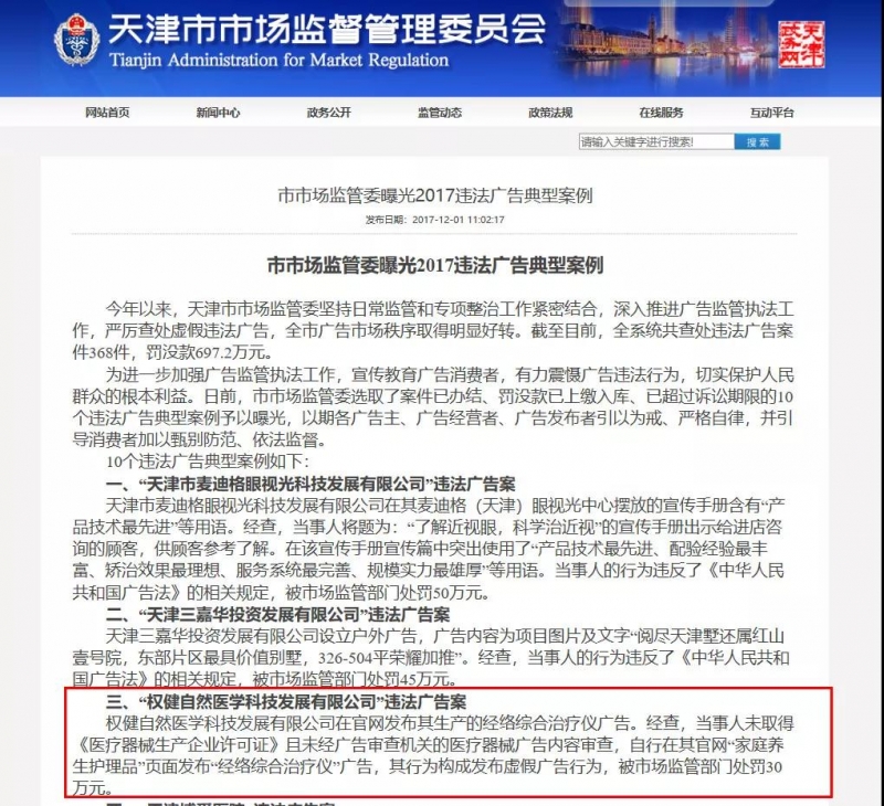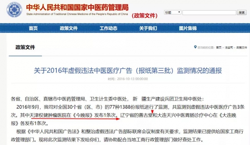 ③2016年10月,国家中医药管理局发布《关于2016年虚假违法中医医疗广告(报纸第三批)监测情况的通报》,通报中称天津权健肿瘤医院医疗广告涉及虚假违法。