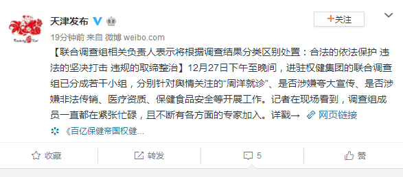 人民网天津12月28日电 据天津市人民政府新闻办公室官方微博@天津发布 消息,12月27日下午至晚间,进驻权健集团的联合调查组已分成若干小组,分别针对舆情关注的“周洋就诊”、是否涉嫌夸大宣传、是否涉嫌非法传销、医疗资质、保健食品安全等开展工作。现场,调查组成员一直都在紧张忙碌,且不断有各方面的专家加入。联合调查组相关负责人表示,将根据调查结果分类区别处置,合法的依法保护,违法的坚决打击,违规的取缔整治。