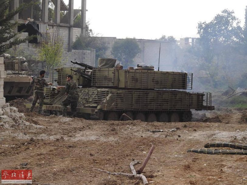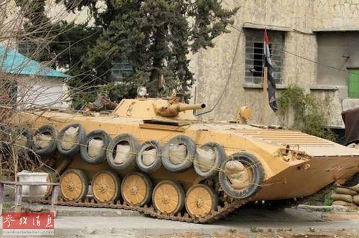 经过多年内战后,叙政府军装甲部队也算是身经百战,为增强装甲车辆对RPG火箭弹和反坦克导弹的防御力,但由于财力和条件所限,他们只能就地取材,为坦克和装甲车安装了各种自制的附加装甲,样式可谓是五花八门。例如图中这辆BMP-1步战车就加挂了轮胎增强防护力。