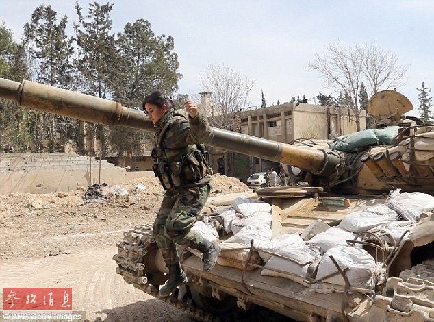 女坦克兵跳下的这辆T-72坦克则是堆满了沙袋,用于加强防弹能力。