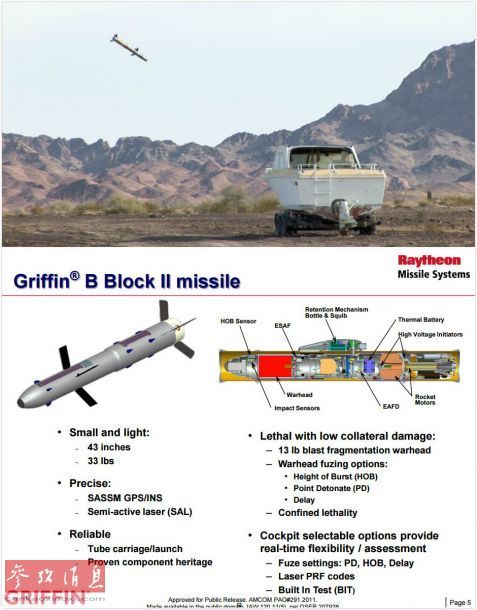 AGM-176“格里芬”(另译“狮鹫”)是一种低成本微型空地导弹,采用GPS或半主动激光制导,配备5.9千克高爆破片弹头,最大射程超15千米,这意味着AC-130W能从便携式防空导弹射程外发动精确打击,这是与过去AC-130系列相比的最大变化。