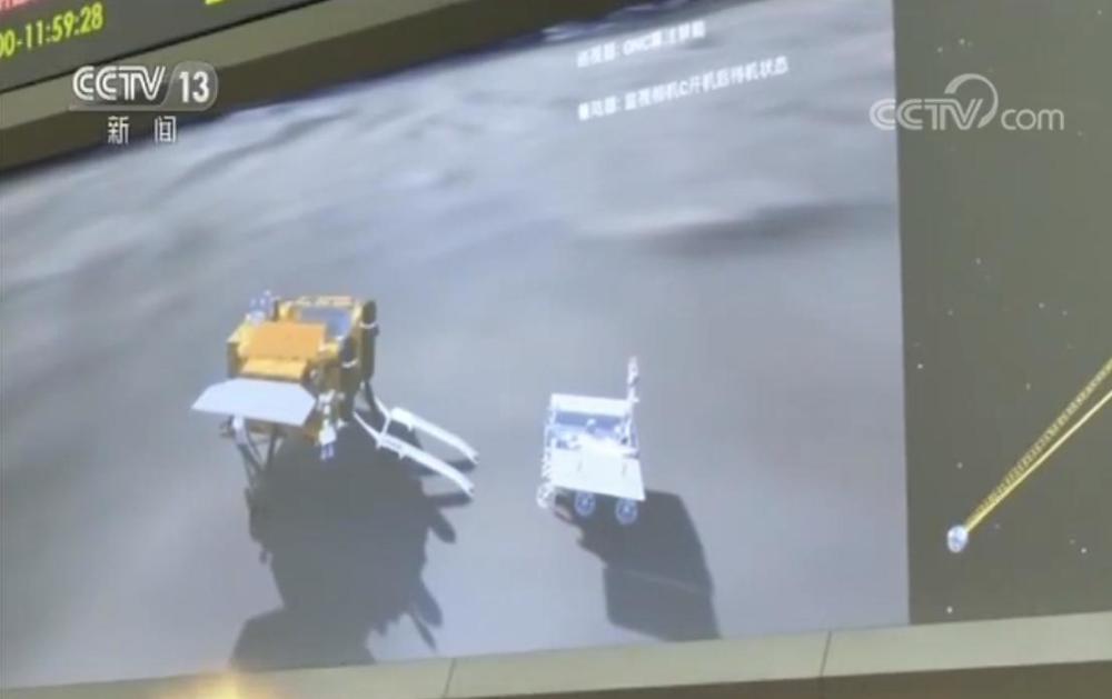 央视记者 吴杰:这里是北京航天飞行控制中心,通过我身后的大屏幕我们可以看到,嫦娥四号探测器已经传回了着陆器上的监视相机拍到的轮子的图像,在大屏幕的中间我们可以看到,通过几个小时的状态调整,目前嫦娥四号探测器正在进行着陆器和巡视器的分离工作。