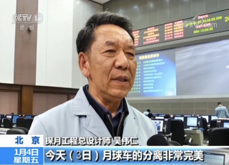 探月工程总设计师 吴伟仁:今天(3日)月球车的分离非常完美,非常顺利,虽然这月球车走了一小步,但是对我们中华民族来说我认为走了一大步,这一大步是在我们太空探索的过程中,在我们征服宇宙的过程中,取得了决定性的一步。