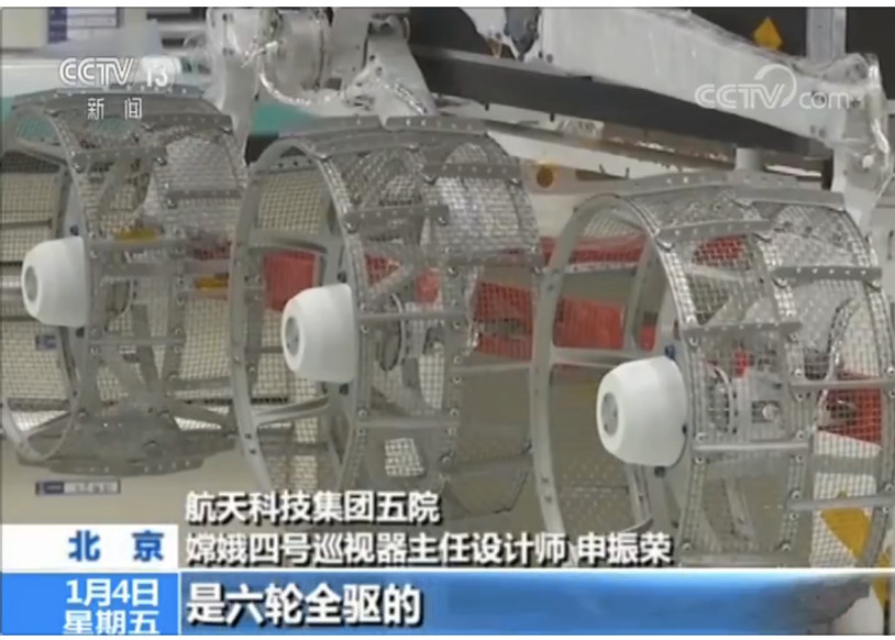 科技集团五院“嫦娥四号”巡视器主任设计师 申振荣:是六轮全驱的,在四个脚轮地方,实际上是有个转向轮。然后靠这个轮摆成一个八字形就可以原地转向。所以我们叫六轮全驱四轮转向。