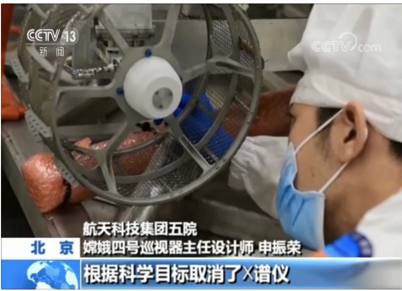 航天科技集团五院“嫦娥四号”巡视器主任设计师 申振荣:根据科学目标取消了X射线探测器,然后换了一个,头部有一个国际载荷是中性原子探测仪,是中国和瑞典合作的一个载荷。像红外光谱仪,还有压在里头的全景相机,以及这个是测月雷达,这都是跟3号一样。