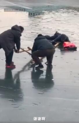 原标题:男子掉入北京展览馆后湖冰窟窿 路过市民拿梯子救人