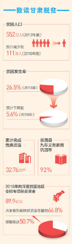 党的十八大以来,甘肃省认真贯彻落实习近平总书记关于扶贫工作的重要论述,紧盯深度贫困地区,瞄准最困难的群体,扭住最急需解决的问题,搞清情况,精细算账,精准施策,明确致富路径、帮扶措施、脱贫时序。深入开展产业扶贫行动,加大财政和金融资金投入力度,大力发展特色产业,提高脱贫持续性和稳定性。将扶贫同扶志、扶智相结合,千方百计激发内生动力,教育引导广大干部群众以更加过硬的作风向贫困发起总攻。经过持续努力,扶贫开发路径由“大水漫灌”向“精准滴灌”转变、扶贫资源使用方式由多头分散向统筹集中转变、扶贫开发模式由偏重“输血”向注重“造血”转变、扶贫考评体系由侧重考核地区生产总值向主要考核脱贫成效转变。