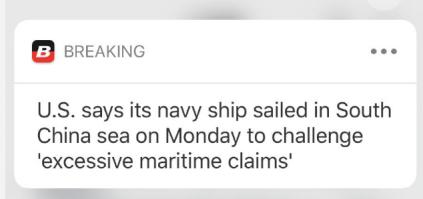 [环球网报道 记者 张飞扬]路透社7日消息,美国方面宣称,其海军军舰周一驶入南海,以挑战中国“过度的海洋主张”。