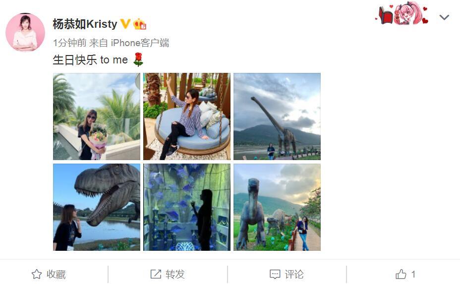 1月7日晚,杨恭如晒出一组游玩照庆祝自己45岁生日,杨恭如发文称:“生日快乐 to me”,照片中杨恭如畅游恐龙乐园,上演了“美女与野兽”的绝美合影。