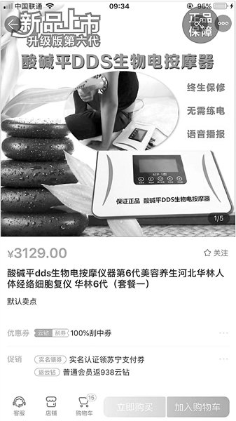 随后,北青报记者又浏览了苏宁易购、唯品会、淘宝、考拉等网站后发现,唯品会、考拉上并没有出现河北华林的任何产品。苏宁易购上依然有自称华林酸碱平系列产品在出售,DDS按摩器型号从一代到六代,价格从1000余元到3000余元不等,而“狻戬平”牌按摩膏、按摩油的价格从几十元到上百元不等。淘宝也有不少商家在出售该系列产品,按摩器的价格从几百元到2000余元不等。