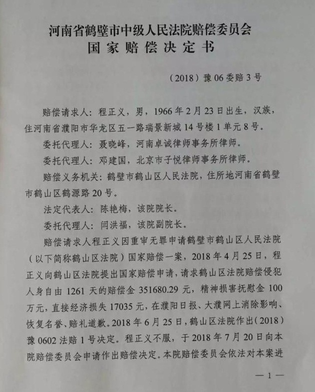 北青报记者在程正义案的《河南省鹤壁市中级人民法院赔偿委员会国家赔偿决定书》中看到,2014年11月13日被鹤山区法院以受贿罪、滥用职权罪判刑十年,程正义不服提起上诉。2018年3月9日太康县人民检察院认为证据不足,不符合起诉条件,对程正义不起诉。2018年9月26日鹤山区人民法院赔偿委员会决定,程正义被限制人身自由1259天赔偿金358487.66元,支付精神抚慰金50000元,并在在河南濮阳工业园区管委会公开为程正义消除影响、恢复名誉、赔礼道歉。