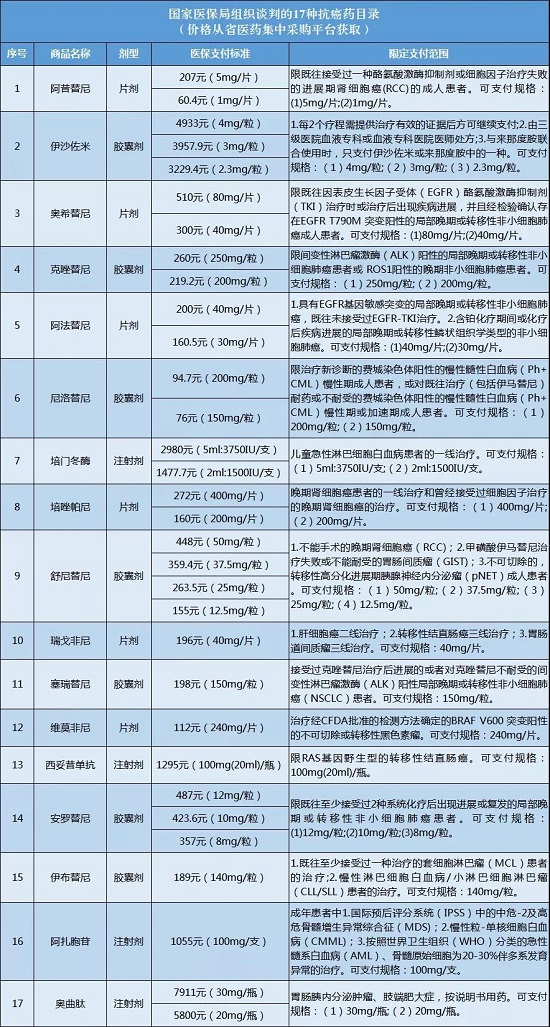 根据党中央关于“把更多救命救急的好药纳入医保”的要求,国家医保局将17种抗癌药通过谈判纳入基本医保、工伤保险和生育保险目录并明显降低了价格。