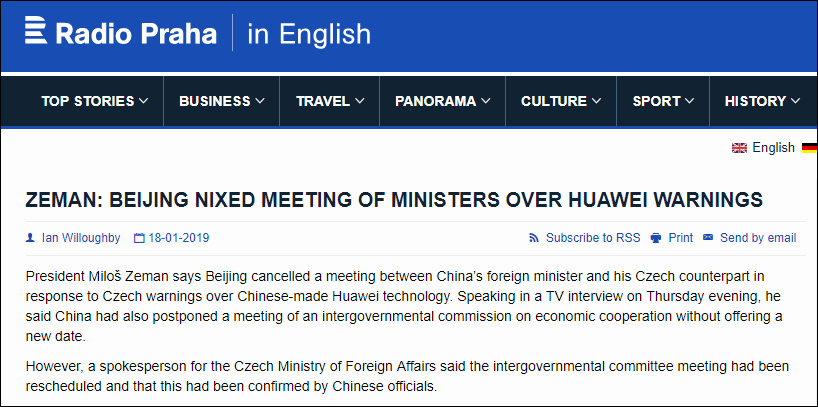 泽曼:针对华为安全警告,中国取消两国外长会谈。截图来自布拉格广播电台