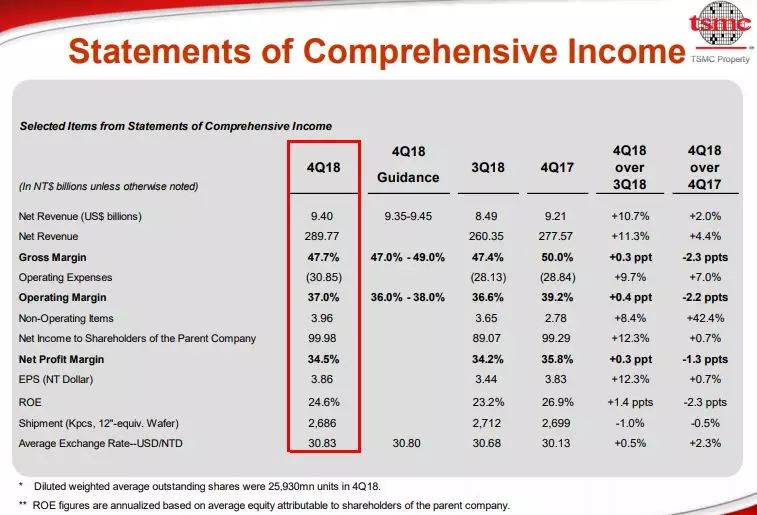 数据显示,台积电2018年全年税后净利润为3511.3亿新台币,每股收益13.54新台币,两项数据均创出历史新高。就2018年第四季度而言,台积电营收接近2898亿新台币,同比增4.4%,环比增11.3%;当季净利润为999.8亿新台币,略高于市场预估的990亿新台币;当季台积电毛利率为47.7%,不及市场预估的48.2%。