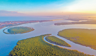 图为海南东寨港国家级自然保护区,红树林连片浓绿,蜿蜒出海。 |