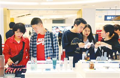 1月19日,顾客在海口免税店内选购化妆品。 海南日报记者 苏晓杰 摄