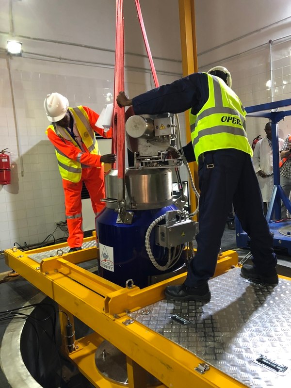 从22日凌晨1点开始,多国专家在尼日利亚陆军第一师的护卫下前往实验室,并从6米深的水池底部取出核燃料堆芯,将其装入一个重达30吨的专用容器TUK145/C中。