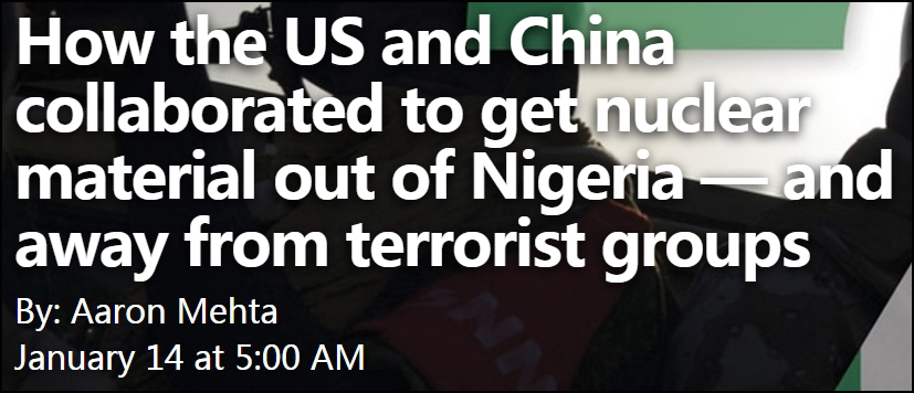 《防务新闻》1月14日报道了这次合作的细节,如美国提供主要经费与安保,俄罗斯公司出飞机与储存容器,中国则为尼日利亚进行微堆低浓化改造,并负责接收转移后的高浓铀。