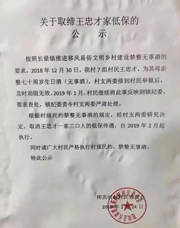 据报道,2018年12月30日,湖北恩施当地有村民为母亲办整70岁生日酒,村支两委接到村民举报后,劝阻无效。今年1月,村民将此事反映到该镇纪委,该镇纪委责令村支两委严肃处理。根据村规民约禁整“无事酒”的规定,村支两委研究决定,取消王某某一家三口的低保待遇,自2月起执行。