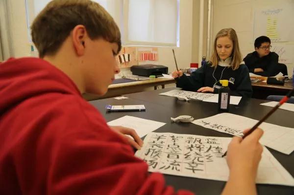 ▲资料图片:2016年3月,在美国旧金山市西奥多·罗斯福中学,中学生参加“汉语桥”杯书法比赛。(刘艺霖 摄)