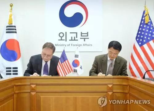 据韩联社2月10日报道,草签仪式2月10日下午在首尔的外交部大楼举行,韩国外交部韩美防卫费分担谈判代表张元三和美方谈判代表蒂莫西·贝茨在协定上签字。据悉,韩美各退一步,韩方接受协定有效期设为1年的美方要求,美方则接受韩方提出的分担额不超过10亿美元的要求。