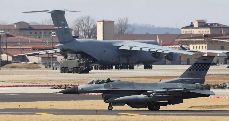 ▲资料图片:2018年3月20日,在位于韩国京畿道平泽市的驻韩美军乌山空军基地,美国F-16战斗机准备降落。(视觉中国)