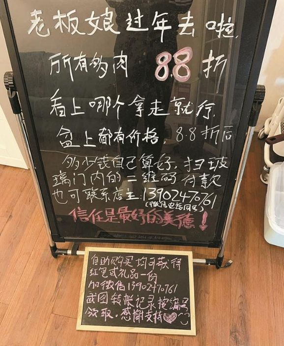 记者看到,王女士花店所有的花卉都摆在门口销售,门口两个“温馨提示”还摆在那里,上面写着“老板娘过年去啦,所有多肉植物88折,盆上有价格多少钱自己算好,扫描门上的二维码付款,也可以电话联系店主。”