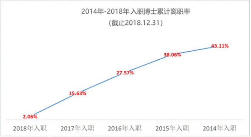 数据分析显示公司博士类员工近5年累计平均离职率为21.8%,入职时间越长累计离职率越高,2014年入职的博士经过4年,只有57%留在公司(如下图表所示)。
