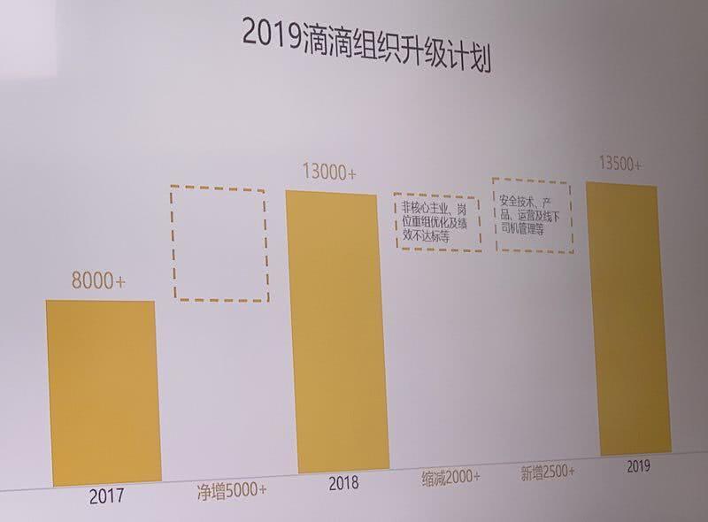 在“关停并转”和裁员的同时,2019年滴滴将在安全技术、产品和线下司机管理及国际化等重点领域加大投入,继续招聘2500人,2019年年底员工总人数将和去年底的13000人持平。