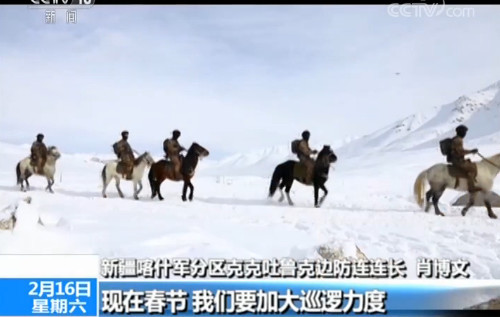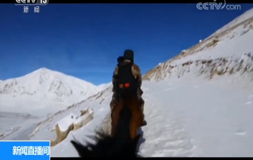 新疆喀什军分区克克吐鲁克边防连连长 肖博文:现在春节,我们要加大巡逻力度,一般三天巡逻一次。巡逻的点位距离连队有23公里,我们主要是前半段采取乘马巡逻的方式,后半程由于积雪过大,马也上不去,后半程采取徒步然后到达点位。骑马的话需要四个小时,然后徒步的话还需要两个小时到三个小时之间。