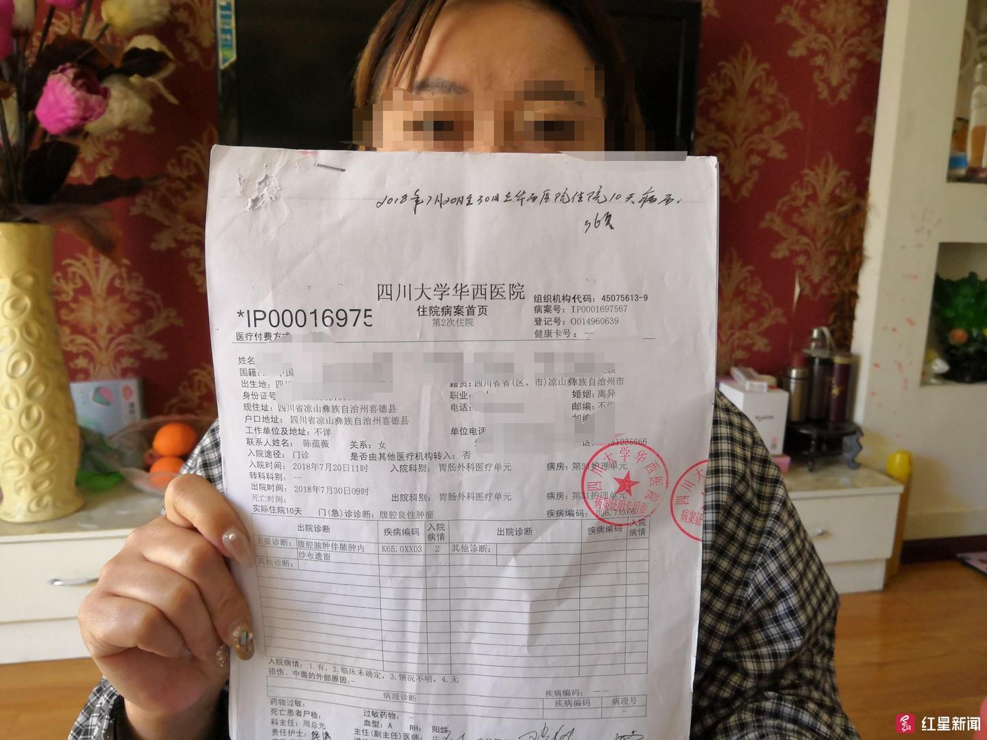 2018年7月初的一天,任女士腹部一阵阵剧烈疼痛,连走路都不行,她被送到凉山州第一人民医院,“医生检查发现包块比之前大了不少,医生建议进行手术,之后就转院到了成都的四川大学华西医院治疗。”
