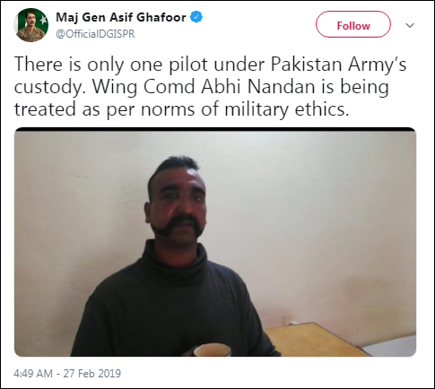 “目前只有一名飞行员被巴基斯坦军方俘虏。空军中校阿比南丹正按照军事医疗伦理接受治疗。”