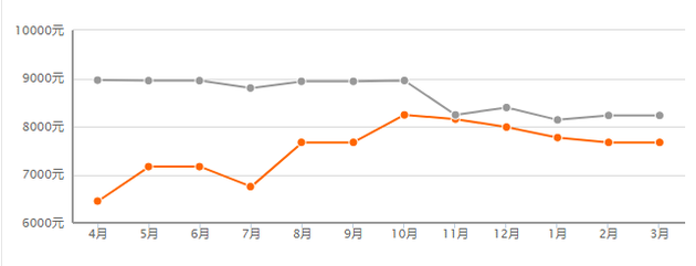 近一年来赣州市(昏色线)和赣县区(橙色线)房价走势 图片来源:安居客