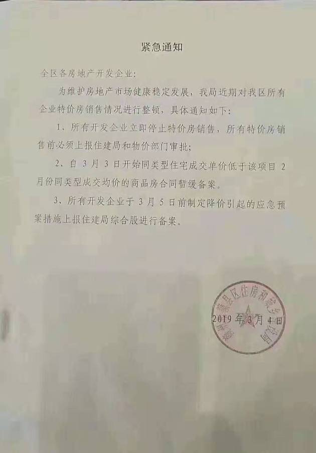 3月6日,江西省赣州市赣县区住房和城乡建设局一纸紧急通知,叫停了区内所有“特价房”销售,且自3月3日开始,同类型住宅成交单价低于该项目2月份同类型成交均价的商品房合同暂缓备案。