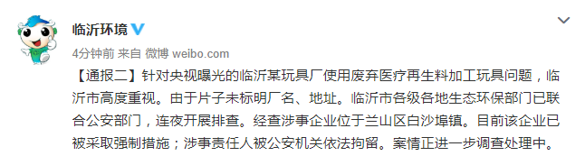 新京报快讯 据山东临沂环保局官方微博消息,针对央视曝光的临沂某玩具厂使用废弃医疗再生料加工玩具问题,临沂市高度重视。由于片子未标明厂名、地址。临沂市各级各地生态环保部门已联合公安部门,连夜开展排查。经查涉事企业位于兰山区白沙埠镇。目前该企业已被采取强制措施;涉事责任人被公安机关依法拘留。案情正进一步调查处理中。