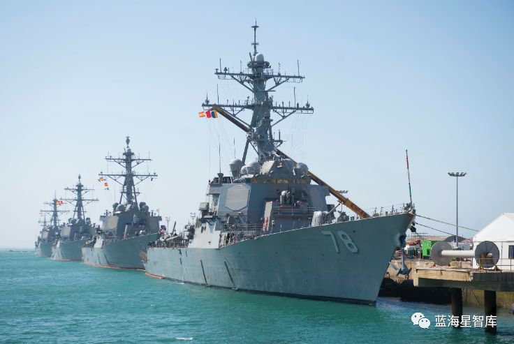 图1 “波特”号驱逐舰(DDG-78)、“唐纳德•库克”号驱逐舰(DDG-75)、“卡尼”号驱逐舰(DDG-64)和“罗斯”号驱逐舰(DDG-71)停泊在西班牙罗塔海军基地(图片中从前往后排列)