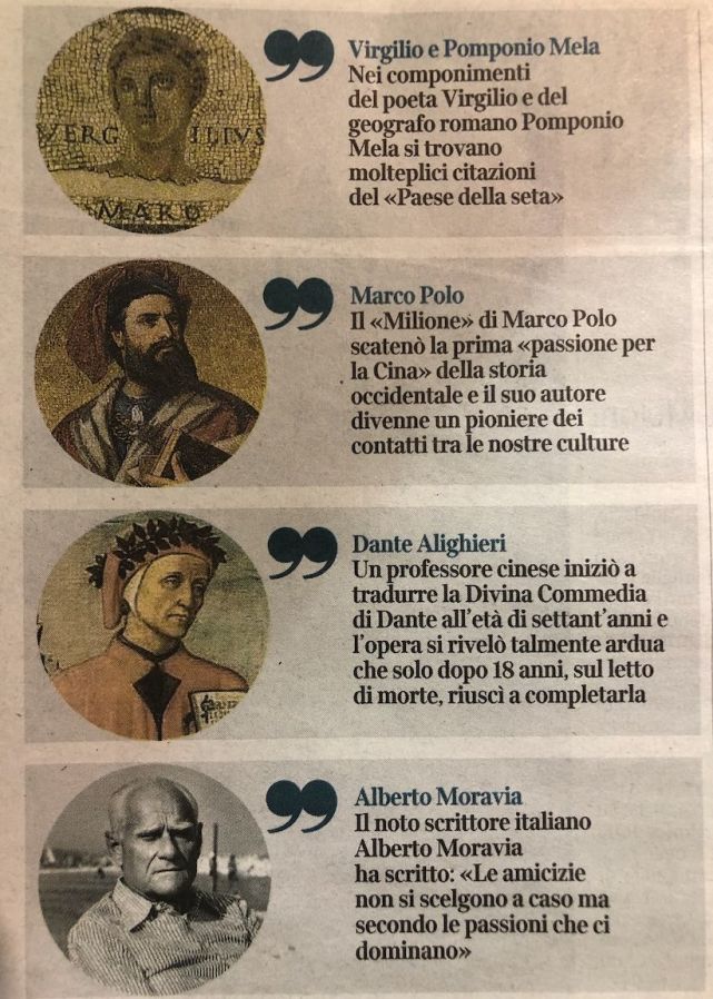 《晚邮报》特意刊出了习主席署名文章中提到的几位意大利名人的图片,自上而下分别是:生活在约两千年前的古罗马地理学家庞波尼乌斯-梅拉,威尼斯探险家马可-波罗,意大利中世纪诗人但丁和20世纪意大利小说家阿尔贝托-莫拉维亚。(央视记者张颖拍摄)