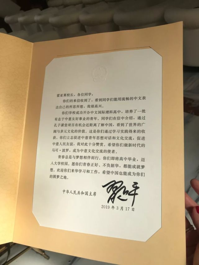 18岁的齐远航就是这23万人中的一个,他是罗马国立住读学校的学生,学习中文5年了。齐远航和学校师生曾给习主席写信,期盼他来意大利访问。最近,他们收到了习主席的回信。