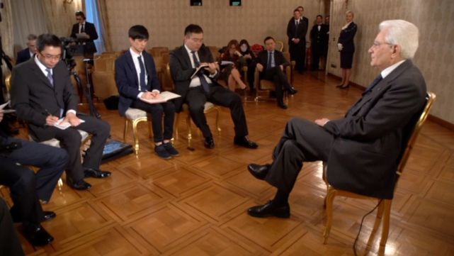 3月19日,意大利总统马塔雷拉接受中央广播电视总台等中国媒体的联合采访。(央视记者李耀洋提供)