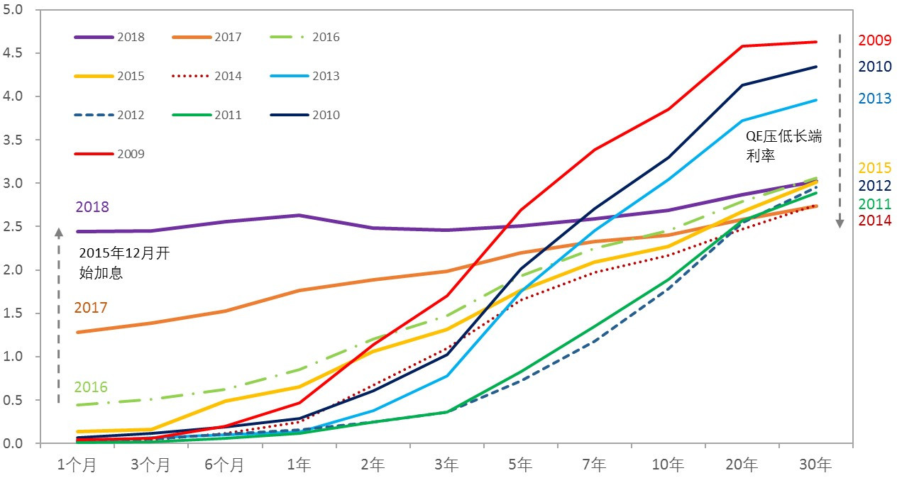 2015年12月,美联储开始加息,从2016-2018年的国债收益率曲线可以看出,短端国债利率随联邦基金利率同步上升,但长端国债利率基本维持在比较低的位置。