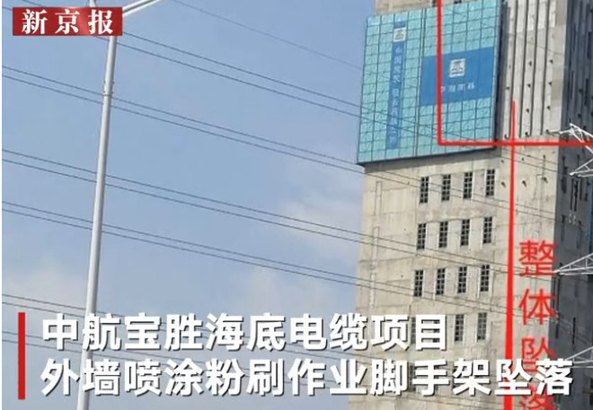 2019年3月21日,中航宝胜海底电缆项目主塔外墙喷涂粉刷作业脚手架发生坠落。经初步核实,截止当天20时30分,事故有11人涉险。21日当晚,涉险人员中有3人经抢救无效死亡。截至3月22日上午,涉险人员中又有3人经抢救无效先后死亡。