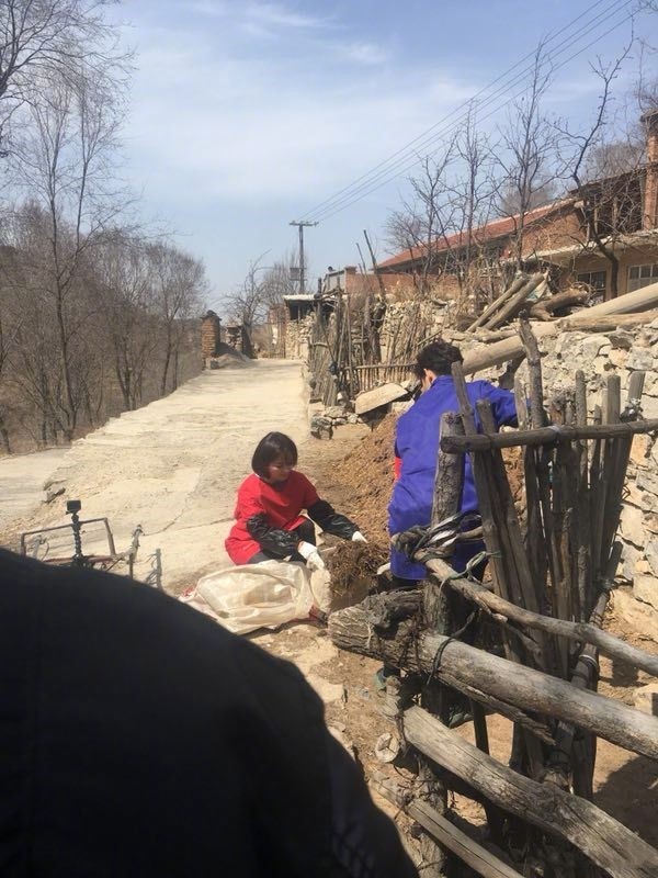 装好肥料后,两人放在了推车上,这时刘涛作为一位女生,居然先王凯一步,推起了车子,而站在一旁的王凯一手拿着铲子,一手不当心地为刘涛稳着肥料,以防掉落。