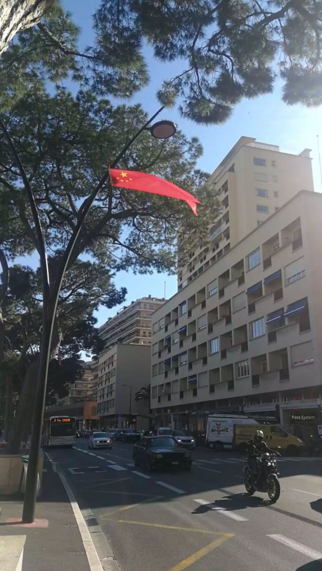 蒙特卡洛赛道上的中国国旗。蒙特卡洛是摩纳哥最著名的一个区。每年五月,狭窄弯曲的街道经过约六周的筹备,化身为无数顶尖车手又爱又恨的“蒙特卡洛赛道”。(央视记者黄京辉拍摄)