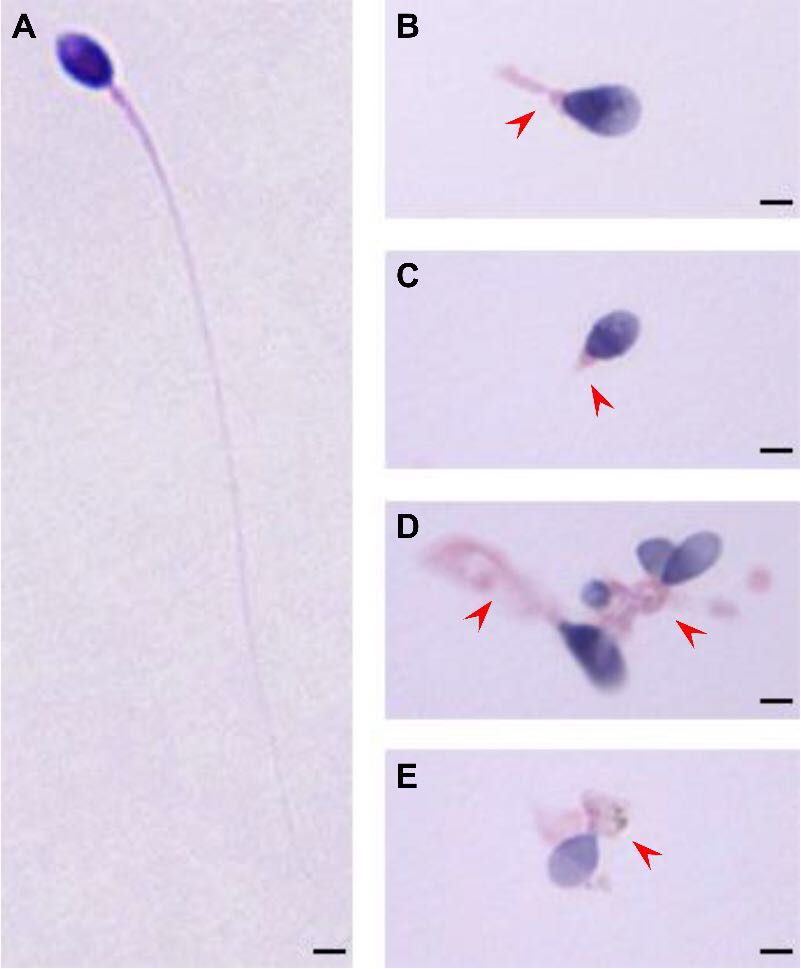 图为正常精子形态(A)和TTC21A基因缺陷患者的精子形态(B-E)
