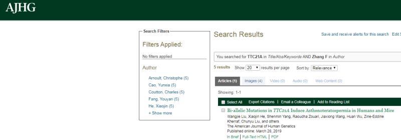 据悉,张锋教授领导的合作团队近年来对弱畸精子症致病基因鉴定及发病机理进行了连续系统性研究和探索,利用全外显子组测序和高效的基因组数据分析方法,在200余例弱畸精子症患者中鉴定到了5例(2.2%)患者携带TTC21A基因的罕见双等位基因突变。其中,在65例汉族弱畸精子症患者中鉴定到了3例(5%)TTC21A基因的罕见双等位基因突变,也在其他人群样本中发现了此类病人。团队在研究中发现,TTC21A缺陷患者的精子头尾连接处异常、尾巴多种形态畸形。