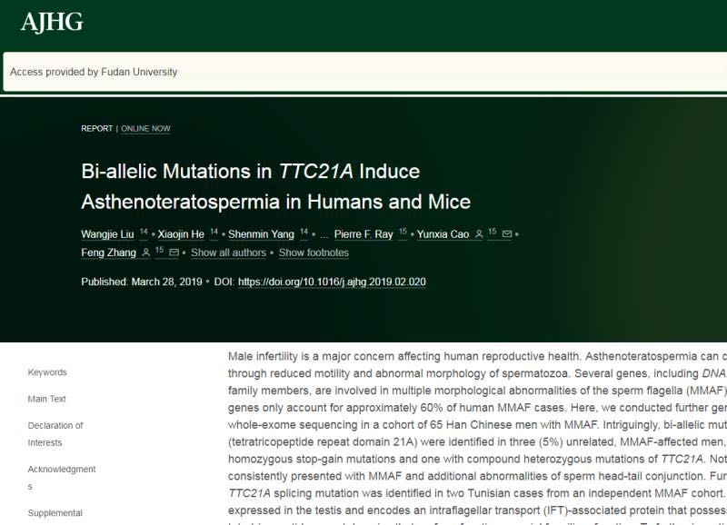 人民网上海3月29日电(葛俊俊 李敏) 今日一早,记者从复旦大学附属妇产科医院获悉,该院张锋教授课题组发现了导致人类弱畸精子症的新致病基因TTC21A,并以“TTC21A基因缺陷导致弱畸精子症”(The American Journal of Human Genetics,五年影响因子10.1)为题在《美国人类遗传学杂志》发表。