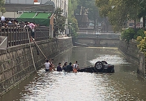 事发时,周边的市民听到一声撞击声,外出查看后,发现河道边围栏被撞破,一辆黑色沪牌SUV倒扣在河道内,前轮仍不停转动,而车内人员没有动静。见此情境,热心市民迅速展开救援。大家将一把扶梯靠在岸边,一名身穿紫色上衣的男子率先下河开展施救,但他发现车门无法打开。于是,岸上又有3位市民先后下到河道中,参与救援。而岸上其他人则帮忙拨打报警电话。