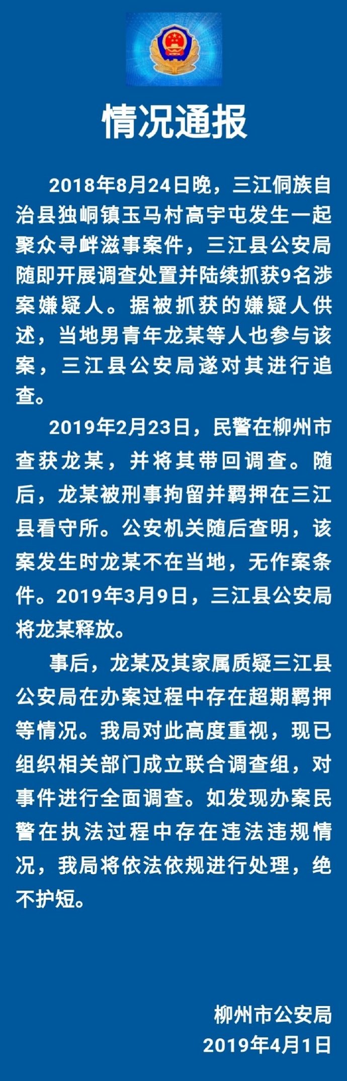 事后,龙某及其家属质疑三江县公安局在办案过程中存在超期羁押等情况。本局对此高度重视,现已组织相关部门成立联合调查组,对事件进行全面调查。如发现办案民警在执法过程中存在违法违规情况,我局将依法依规进行处理,绝不护短。